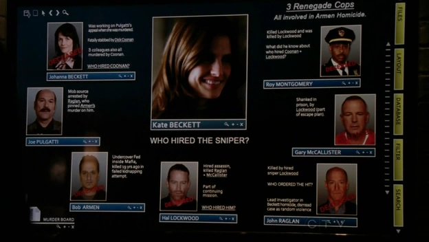 Meanwhile, Ryan and Esposito eventually identified the sniper, Hal Lockwood. He and his team had been tracking Beckett, attempting to discover how far along her investigation was. When Lockwood himself was compromised, his team ambushed Ryan and Esposito and tortured them for information. The two were rescued by Castle and Beckett. Beckett killed most of Lockwood's team, and Castle subdued Lockwood with his bare hands. Lockwood kept silent after his arrest, and Beckett visited the jail weekly to interrogate him.