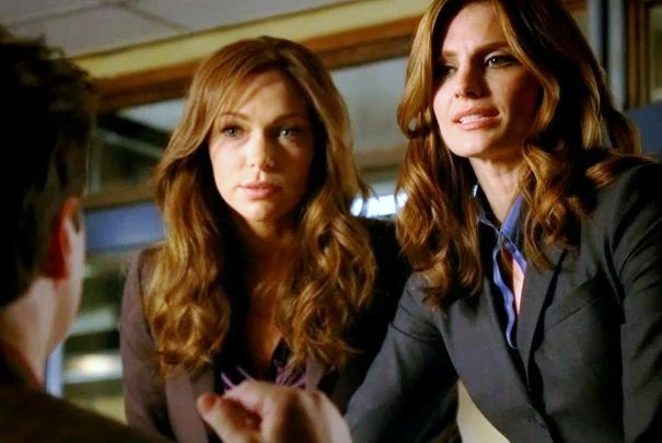 Prepon (left) in costume as Nikki Heat – a character based on Detective Kate Beckett, played by Stana Katic (right).